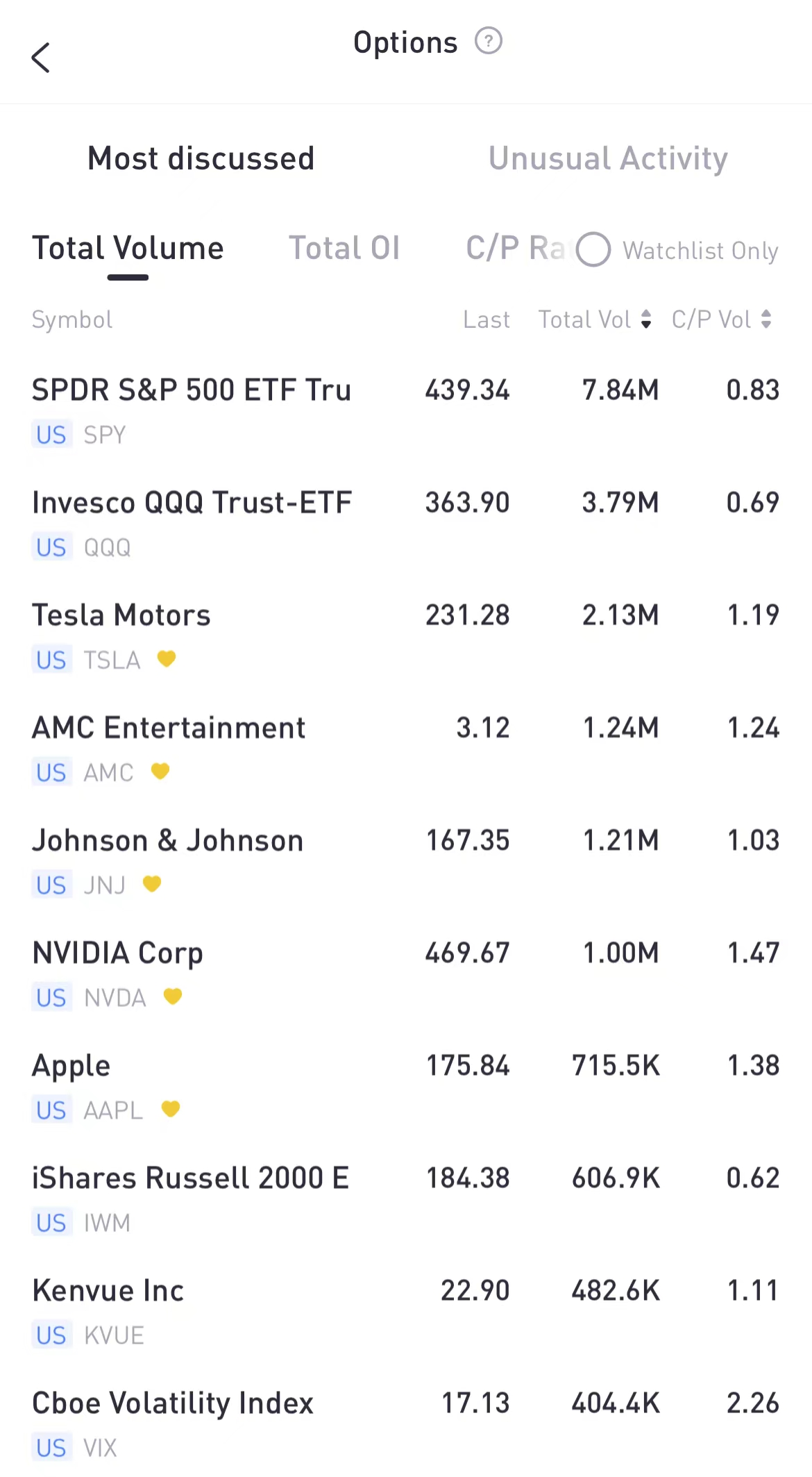 Top 10: SPY; QQQ; TSLA; AMC; JNJ; NVDA; AAPL; IWM; KVUE; VIX