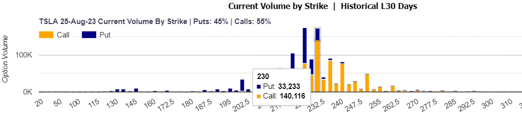 A total number of 2.13 million options related to Tesla was traded, down 43% from the previous trading day. A particularly high trading volume was seen for the $230 strike call options expiring August 25th, with a total number of 140,116 option contracts trading on Monday.