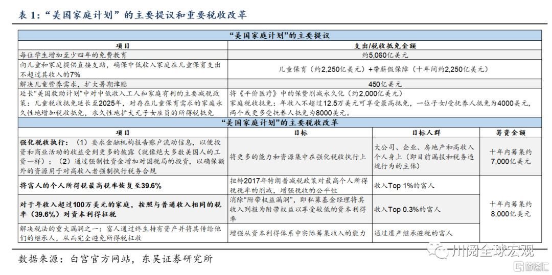 美国东部时间4月28日,拜登发表上任以来首次国会演说,在两院联席会议上公布1.8万亿美元的基建第二弹“美国家庭计划”:10年内投资约1万亿美元+家庭和工人约8000亿美元的减税额,核心为人力基础设施投资。总计约4万亿的基建计划至此全部揭晓。拜登提出对富人增税来为基建第二弹筹资,针对富人的系列税收改革(表1)预计将在十年内筹集约1.5万亿美元,并最终使得富人税收漏洞减少、中低收入美国人的机会增加。