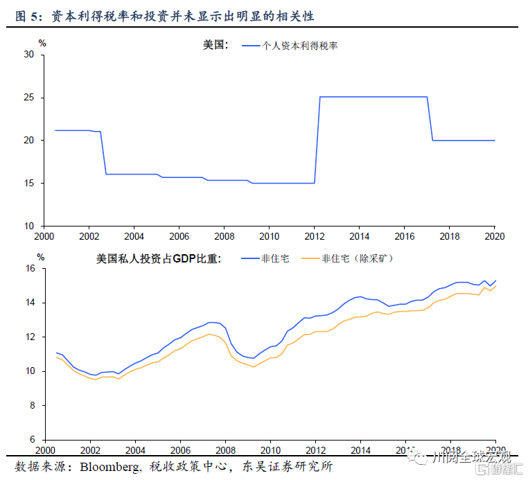 没有证据表明将会显著影响长期投资。公司投资主要受经济周期,尤其是市场总需求的影响,对税率的弹性不大。特朗普税改将公司税率从35%降至21%,但并未有效刺激投资(图4)。资本利得税方面,迪斯表示,长期投资大部分来自养老基金、主权财富基金等对税收不敏感的实体,因此资本利得税率和投资并未显示出明显的相关性(图5)。