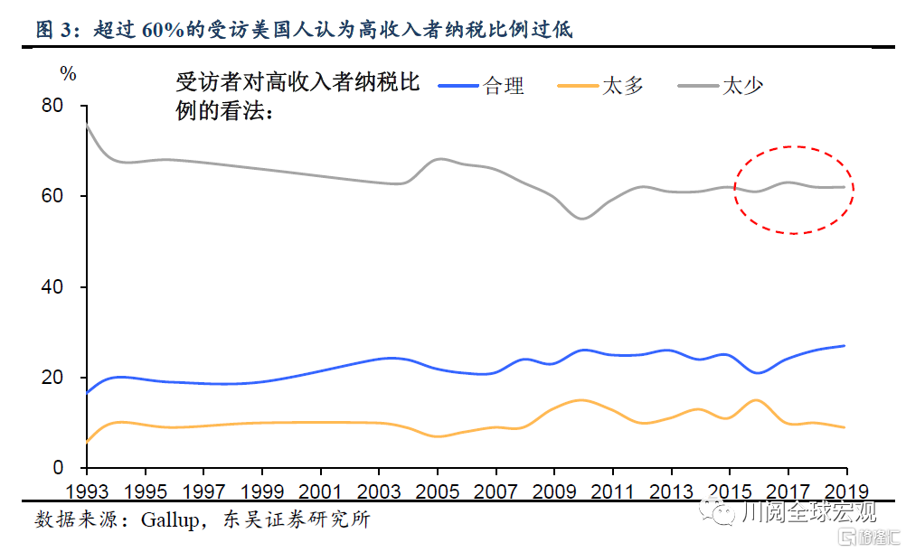 迪斯近期讲话,政府通过对富人征税筹资并进行更高回报的投资,受到了两党的支持。Gallup民调数据显示,超过60%的受访美国民众认为富人纳税比例过低(图3),可见对富人增税受到美国民众认可。