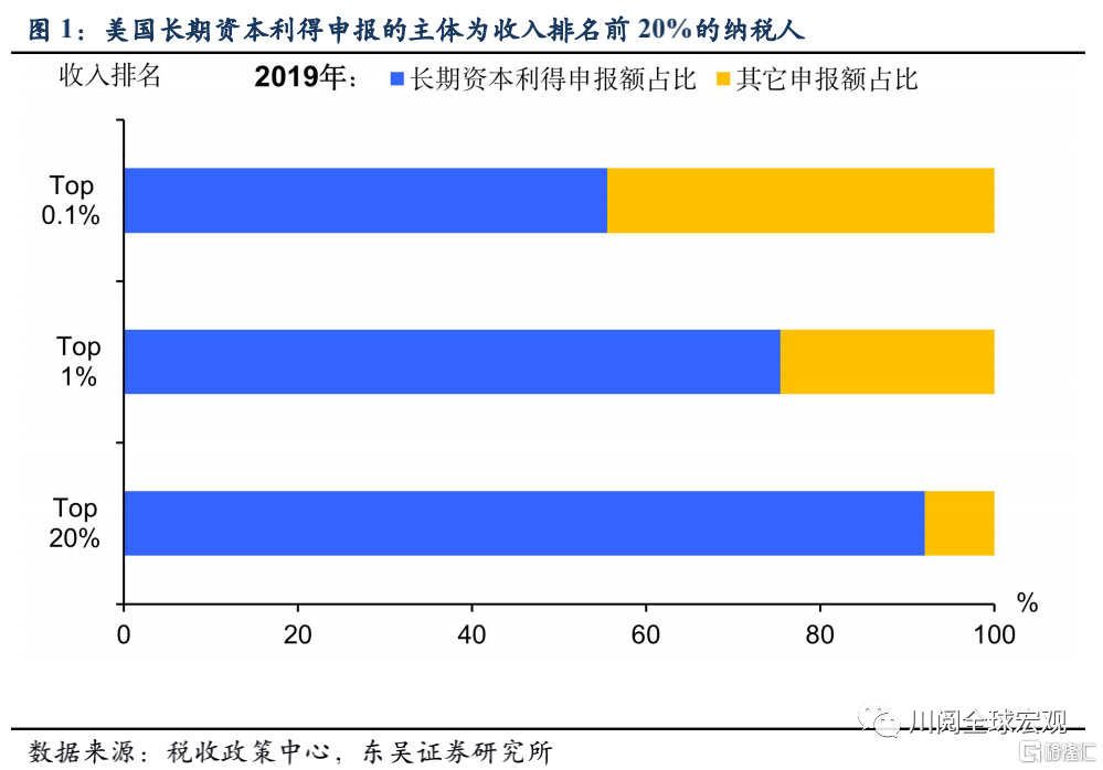 近年来,工资收入与资本利得的税率差处在17%的高位,大量富人将收入转移至资本利得来避税。白宫国家经济委员会主任迪斯指出,2000年来,年收入>6000万美元的富人,税率仅约20%,低于许多中产阶级。普通民众约70%的收入来自工资,而年收入≥100万美元的富人仅约30%,收入Top 1%的富人占比长期资本利得申报总额的75%(图1)。对富人增收资本利得税来为“美国家庭计划”融资,可谓劫富济贫。