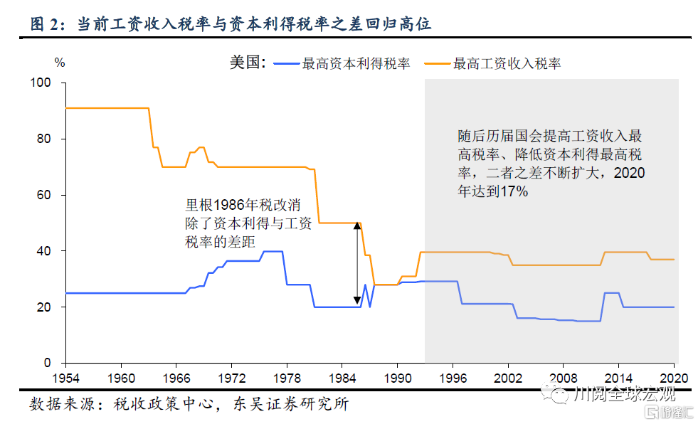 以史为鉴,里根总统曾增收资本利得税以限制富人避税:80年代,低资本利得税率使得富人通过大量投资,产生利息等抵扣项以减少税负,收获长期资本利得。里根1986年税改法案提高资本利得税率、降低工资收入税率、将二者上限均设为28%(图2),消除税率差,使避税计划无利可图。这与拜登政府的初衷一致。