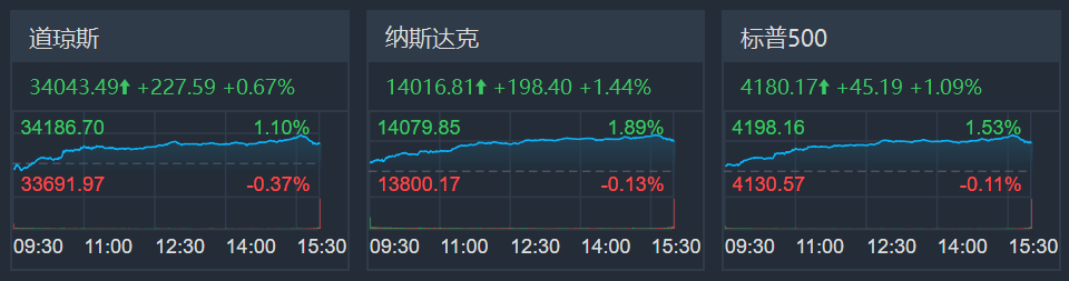美东时间周五,市场对白宫富人税的担忧情绪缓解,美股全线反弹,纳指涨近1.5%,领涨三大股指。银行股集体上涨,瑞士信贷涨4.40%,摩根士丹利涨3.40%,花旗涨2.25%,高盛涨2.57%,摩根大通涨1.91%。截至收盘,道琼斯指数涨0.67%,报34043.49点;标普500指数涨1.09%,报4180.17点;纳斯达克指数涨1.44%,报14016.81点。