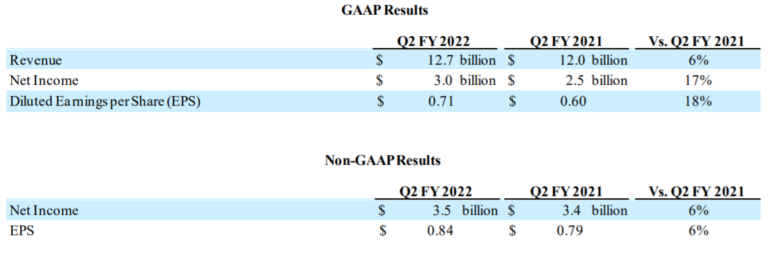 在截至2022年1月29日的这一财季,按照美国通用会计准则,思科的净利润为30亿美元,与去年同期的25亿美元相比增长17%。按照美国通用会计准则,思科第二财季每股摊薄收益为0.71美元,相比之下去年同期的每股摊薄收益为0.60美元,同比增长18%。