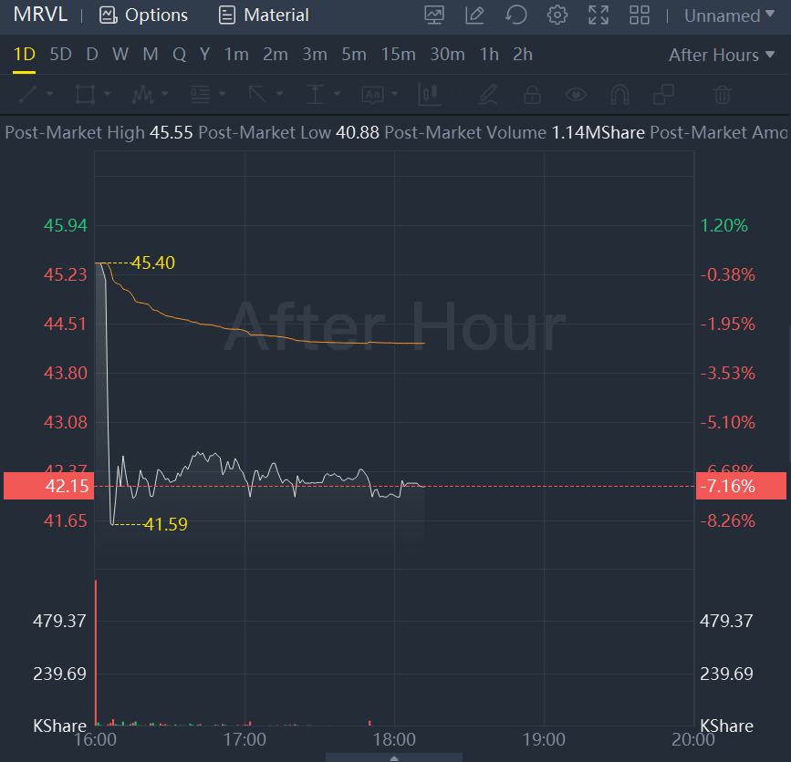 Marvell stock was down 7.2% to $42.13 in extended trading Thursday. Marvell shareshave struggledthis year amid abroader slump for semiconductor stocks.The stock was down 48% so far this year at Thursday’s close.