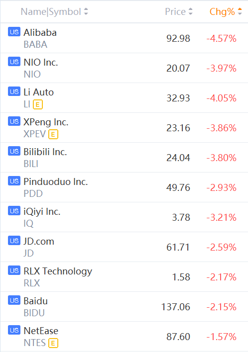Alibaba, Baidu, Bilibili, iQiyi, JD.com, Nio, Li Auto, NetEase, Pinduoduo, and RLX Technology fell between 1% and 4%.