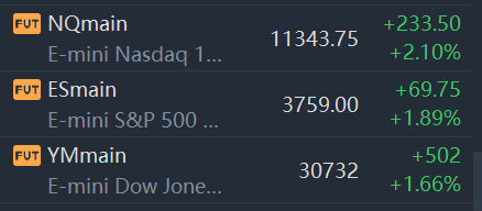 At 8:04 a.m. ET, Dow e-minis were up 502 points, or 1.66%, S&P 500 e-minis were up 69.75 points, or 1.89%, and Nasdaq 100 e-minis were up 233.5 points, or 2.1%.