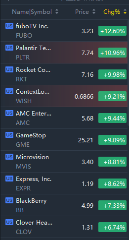 Meme stocks rebounded in morning trading; fuboTV Inc. gained over 12% and Palantir Technologies Inc. gained over 10%.
