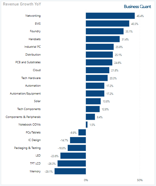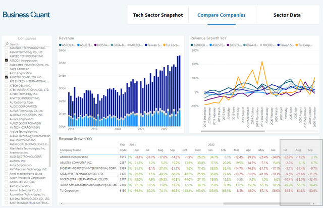 We, at Business Quant, have developed a tool to serve exactly this purpose. It tracks and monitors monthly sales data for over 1200 Taiwanese suppliers, so we can get insights about the state of supply chains across different industries. Note in the chart below that sales of Gigabyte, Micro Star International, Biostar Microtech and Tul Corporation shrank significantly from July through September. These firms manufacture Nvidia-branded GPUs, motherboards and/or other computing peripherals. Also note that for a few companies, the sales decline accelerated in September. This suggests that financials for Nvidia’s channel partners are deteriorating quickly.