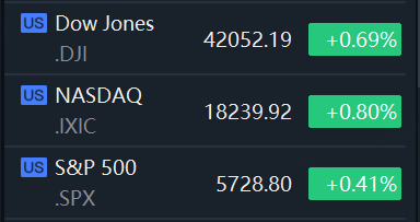 The Dow Jones Industrial Average rose 288.73 points, or 0.69%, to 42,052.19, the S&P 500 gained 23.35 points, or 0.41%, to 5,728.80 and the Nasdaq Composite gained 144.77 points, or 0.80%, to 18,239.92.