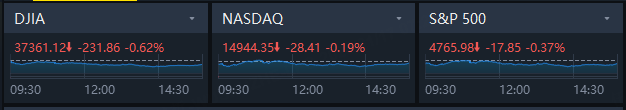 The S&P 500 declined 0.37% to end the session at 4,765.98 points. The Nasdaq declined 0.19% to 14,944.35 points, while Dow Jones Industrial Average declined 0.62% to 37,361.12 points.