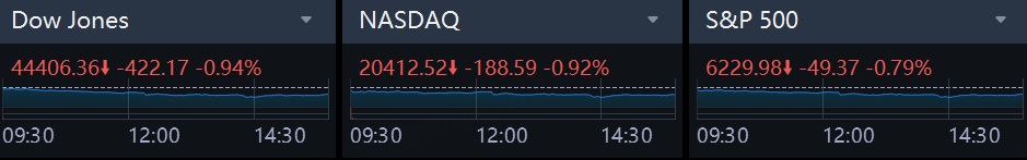 The Dow Jones Industrial Average fell 422.17 points, or 0.94%, to 44,406.36, the S&P 500 lost 49.37 points, or 0.79%, to 6,229.98 and the Nasdaq Composite lost 188.59 points, or 0.91%, to 20,412.52.