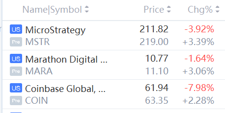 Marathon Digital and MicroStrategy shares were up more than 3%; Coinbase stock rose over 2%