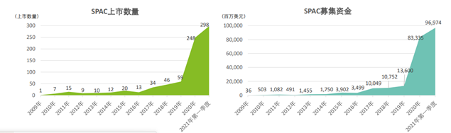 从李泽楷、郑志刚还是贾跃亭来看,无论是企业方还是资金方,都在赶潮SPAC“热浪”。这一上市模式在美股市场在2020年呈爆炸式增长,2021年更为炙手可热。统计数据显示,SPAC上市数量2018年到2020年分别为46宗、59宗和248宗,今年首季则达到了惊人的298宗,这意味着今年仅仅一季度发行数量和融资额都已经超越了去年全年,同时今年的SPAC交易必然会刷下新纪录。