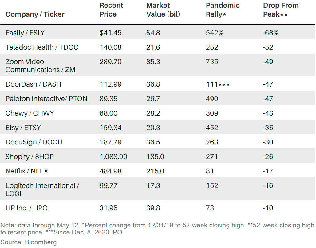 After a furious rally during the pandemic, stay-at-home stocks have taken a backseat to an economic rebound.
