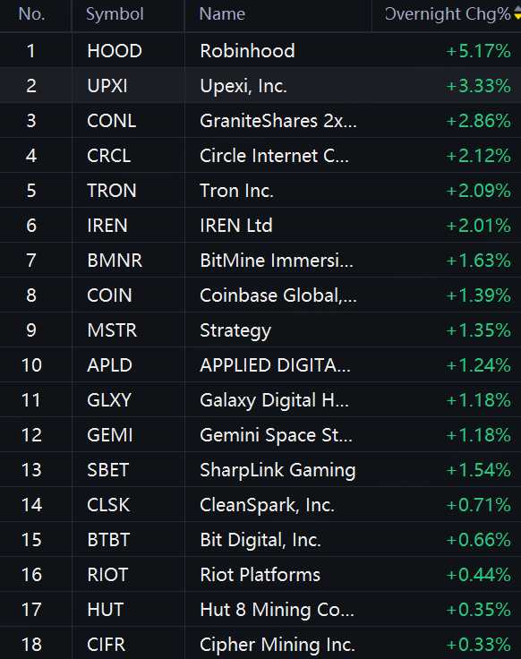 Crypto Stocks Jump in Overnight Trading. Robinhood up 5%; Circle up 2%; Bitmine, Coinbase and Strategy up 1%.