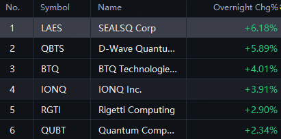 Quantum shares rally in overnight trading; Sealsq and D-Wave Quantum up Around 6%; BTQ and IONQ Stock up 4%; Rigetti and QUBT up 2%.