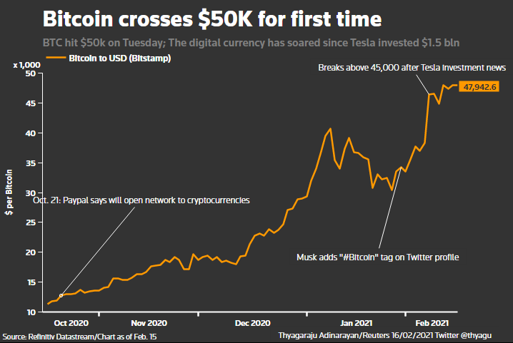 Bitcoin rose above $50,000 on Tuesday for the first time, adding steam to a rally fuelled by signs that the world’s biggest cryptocurrency is gaining acceptance among mainstream investors and companies.