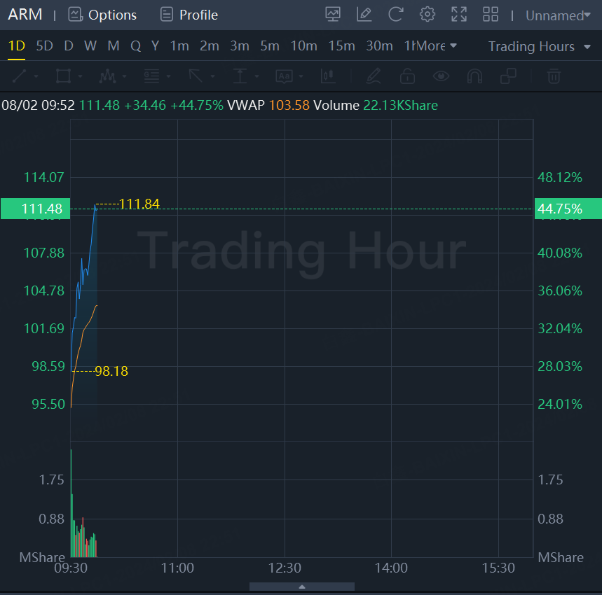 Arm’s American depositary receipts were up 45% at $111.48 in morning trading on Thursday after the company beat expectations for earnings and outlook in its report after the close on Wednesday.