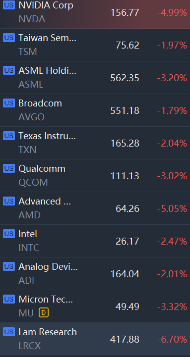 Semiconductor stocks dropped in morning trading. Nvidia and AMD fell 5%; Lam Research fell 6%; ASML and Micron fell 3%.