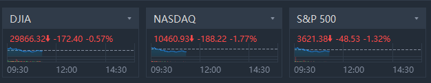U.S. stocks exhausted their momentum in morning trading; Dow Jones slid 0.57%, S&P 500 fell 1.32% while Nasdaq crashed 1.77%.