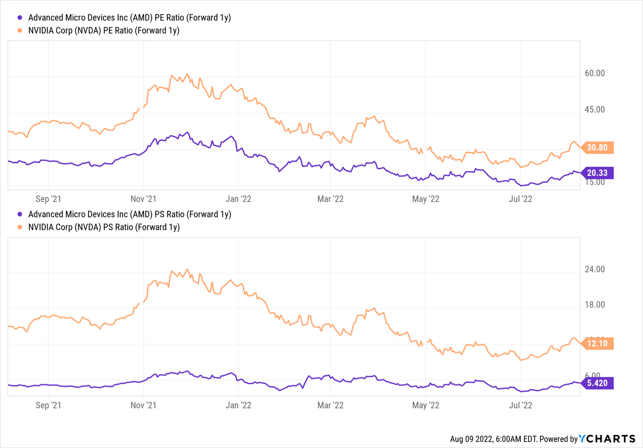 Compared against NVIDIA, which just pre-released FQ2'23 earnings, AMD is the better deal for me here. Nvidia saw a 33% decline in Gaming revenues in FQ2'23 and although AMD also saw declining graphics cards revenues, total Q2'22 results were much better and didn't show the massive revenue deceleration that Nvidia reported. Based off of valuation (20.3 X P/E ratio for AMD vs. 30.80 X for Nvidia) and execution, I believe AMD is the better choice.
