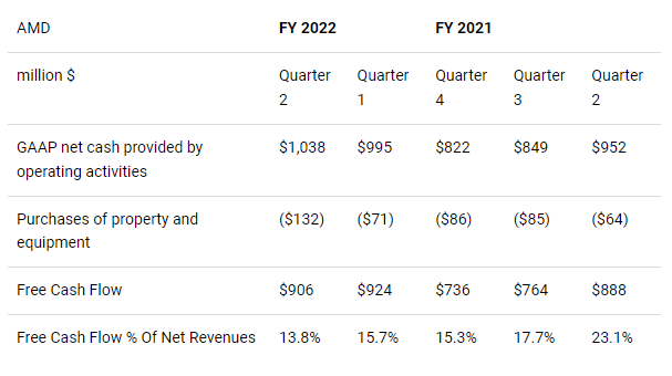 Strong EPYC server processor sales pushed AMD’s operating cash flow above $1.0B in Q2’22 for the first time. AMD’s free cash flow didn’t mark a new record due to higher capital expenditures, but remained solid above $900M. AMD's free cash flow margin declined sequentially to 13.8% and may come under more pressure if AMD’s pricing power in the Gaming market wanes going forward.