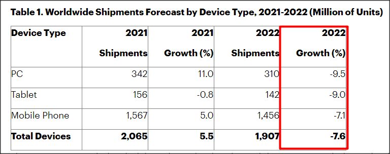 Intel has warned the market that PC shipments are expected to remain weak in 2022 which is set to weigh on processor sales in the industry. According to consulting company Gartner, shipments of PCs, tablets and mobile phones are projected to decline 7.6% this year with shipments of PCs expected to see the largest decline of 9.5%. The reason for the down-turn in the PC market is that consumers bought new computers during the pandemic for remote work, meaning they don’t have a pressing reason to upgrade their equipment again. The expectation of a down-turn in the PC industry led Intel to issue a truly devastating outlook for FY 2022and AMD has also cautioned that the PC market will remain weak.