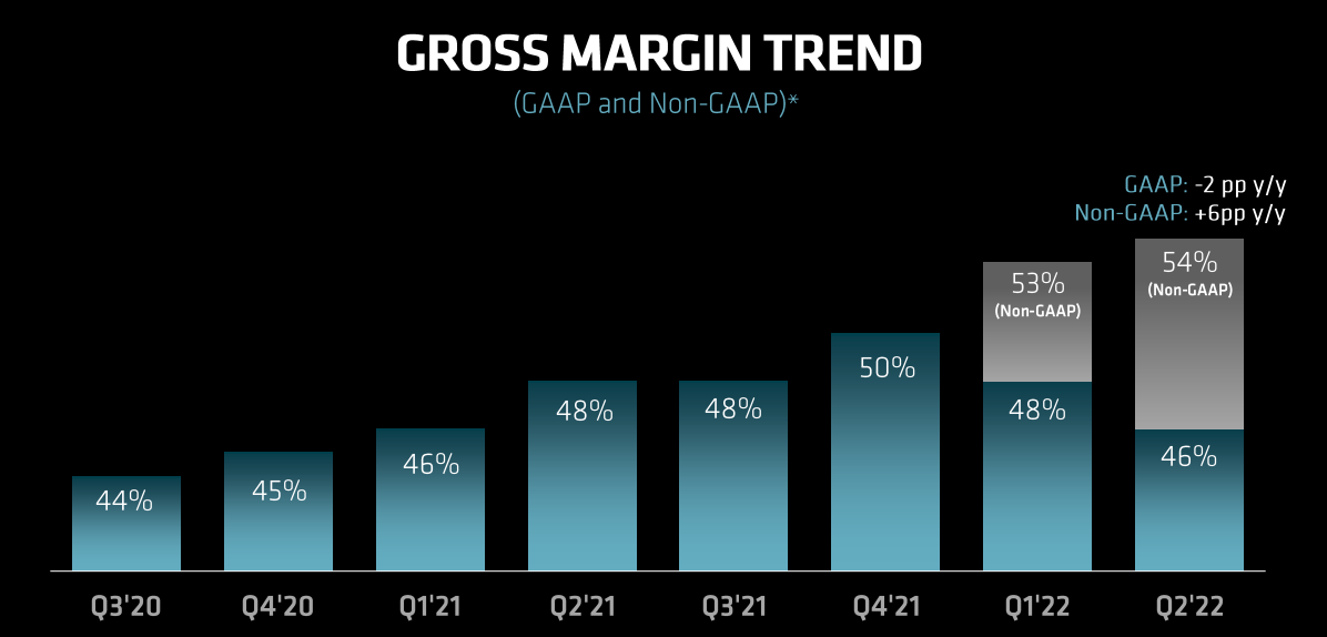 I don’t worry about AMD’s gross margins, yet. In Q2’22, AMD’s non-GAAP gross margins improved 1 PP sequentially and 6 PP year over year to 54%, largely because of strong execution in Data Centers and the Embedded business. The Embedded business essentially includes the product portfolio taken over by AMD through its acquisition of Xilinx.