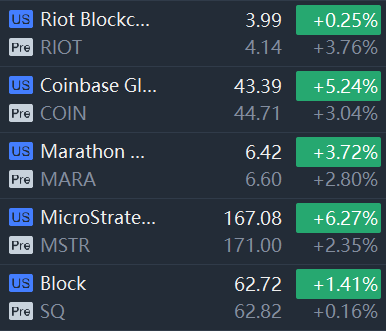 Crypto stocks rallied in premarket trading. Riot Blockchain and Coinbase rose 3%; Marathon Digital and MicroStrategy rose 2%.