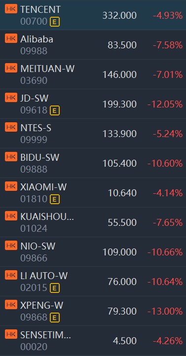 Tencent, Alibaba, JD.com, NetEase, Baidu, Xiaomi, Kuaishou, Bilibili, Nio, Xpeng and Li Auto fell between 4% and 13%.
