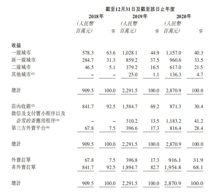 招股书显示,从2017年12月起,奈雪开始走出广东地区,向全国范围内扩张。截至最后实际可行日期,奈雪在国内70多个城市以及日本大阪开出556多家直营门店。根据灼识咨询数据,截至2020年12月31日,按覆盖的城市数目计算,奈雪拥有覆盖中国最广泛的高端现制茶饮店网络。