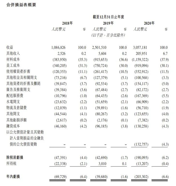招股书显示,非通用会计准则下,奈雪净亏损已从2018年的5658万元大幅减少至2019年的1174万元;而在2020年,奈雪更是扭亏为盈,净利润为1664万元。(非通用会计准则是公司依据自身情况在通用会计准则标准的基础上自行调整,一般是将很多非经营相关、以及偶然发生的损益进行剔除,目的是更好地展示公司的实际经营状况)。如使用更准确地反映公司实际租金水平的国际会计准则第17号,奈雪2020年全年实现净利润6217万。