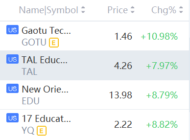 Gaotu Techedu, TAL Education, 17 Education & Technology Group, and New Oriental Education & Technology rose between 7% and 11%.