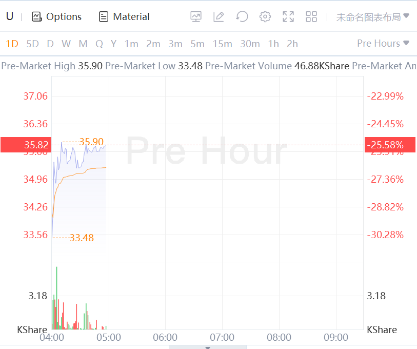 Unity Software Inc. shares plummeted 25% in premarket trading after the company issued second-quarter revenue guidance below analysts' expectations in conjunction with its first-quarter results.The video gaming software developer widened its loss to $177.6 million, or 60 cents a share, for the quarter ended March 31, compared to a loss of $107.5 million, or 39 cents a share, in the year-ago period. Adjusted loss was 8 cents a share, matching analysts' expectations.