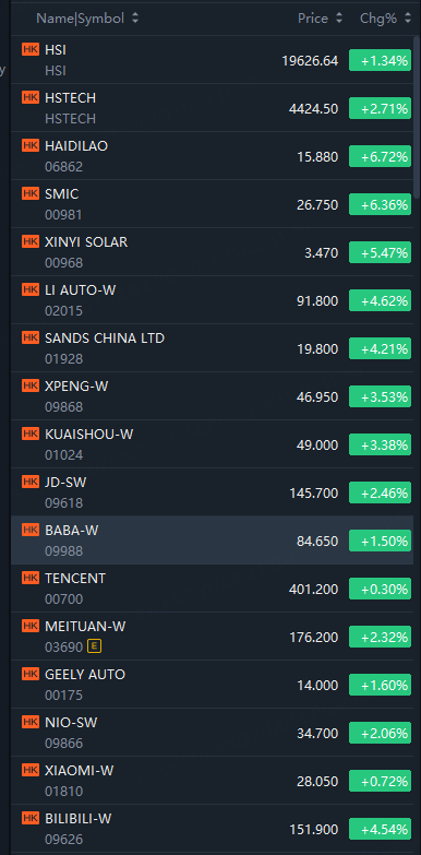 Haidilao, SMIC rose 6.5%; Xinyi Solar rose 5.5%; Li Auto rose 4.6%; Sands China rose 4.2%; XPeng rose 3.5%; Alibaba rose 1.5%.