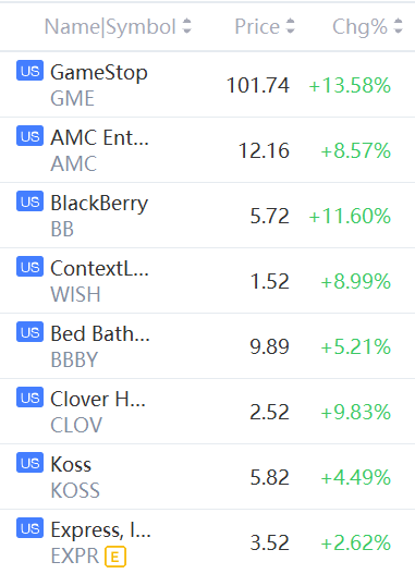 AMC, GameStop, Bed Bath & Beyond, Koss, BlackBerry and WISH rose between 2% and 13%.