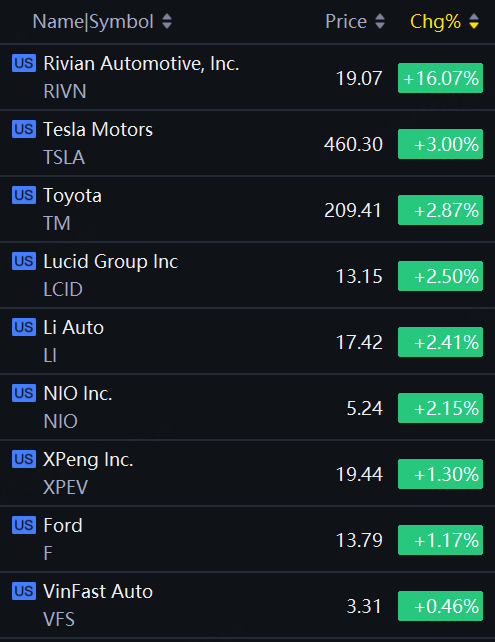 EV shares jumped on Friday. Rivian up 16%; Tesla up 3%; Toyota, Lucid, Li Auto, NIO up over 2%; XPeng, Ford up over 1%.