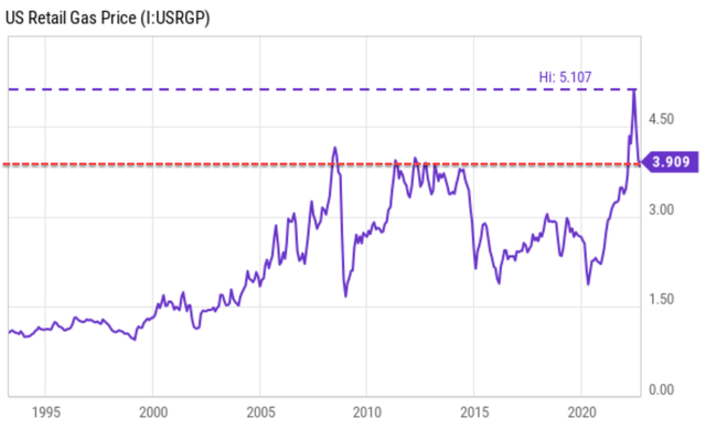 However, on the negative side, the impacts of China’s COVID lockdown may still take time to clear up, and new lockdowns are very possible given the recent resurgence in key Chinese cities. At the same time, gasoline prices remain near a historical high. According to YCharts data shown below, the national average price per gallon of unleaded gasoline is $3.91. It is about 23% below the peak of $5.1 reached recently, but still among the highest level since 1995 as seen.