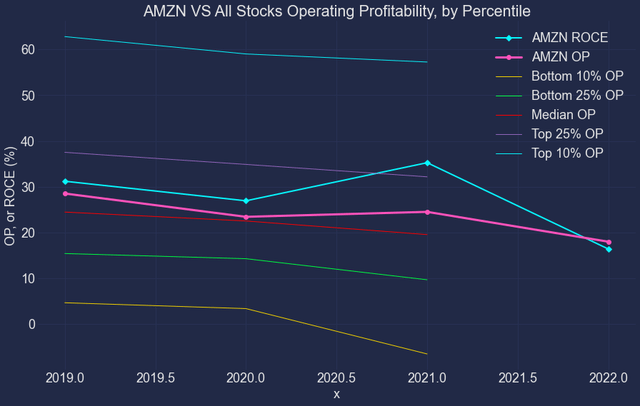 To recap, despite large price corrections, I still see a mixed picture for AMZN under its current conditions. AMZN faces a multitude of headwinds, including shipping cost, inflation, foreign exchange rates, et al. I anticipate these headwinds to keep their pressure on its profitability, which is not super-competitive to start with. Its profitability, either measured by OP or ROCE, has oscillated between the top 25% and the market median most of the time. And they are currently slightly below the market median.