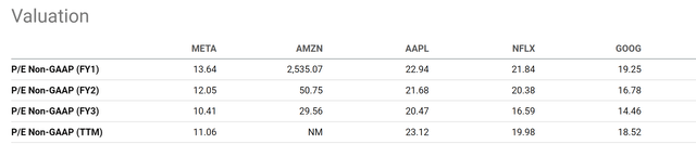 Now move on to the valuation factor. As aforementioned, due to its current negative cash flow and negligible accounting EPS, valuation metrics in terms of bottom lines are not meaningful for AMZN (FY1 GAAPP/E is 2531x). Even its FY2P/E of 50.75x is still too high when compared to the FAAMG group: more than 4x higher than META, 3x higher than GOOG, and 2x higher than AAPL and NFLX.