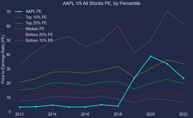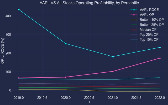As such, under current conditions, we see better alternatives even within the FAAMG group. For example, the following two charts show the OP andP/E scores for Apple (AAPL). You can see the picture is completely the opposite when compared to AMZN. AAPL’s profitability, either measured by OP or ROCE, is far superior to the overall market as shown in the first chart. Yet, its valuation is only slightly above the market median.