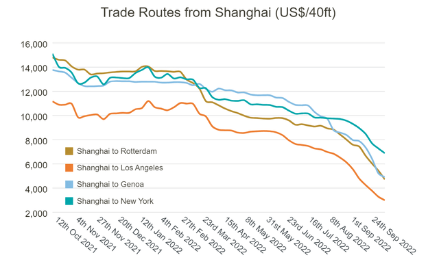 On the positive side, the overseas shipping cost has gone down dramatically since its peak reached around September and October 2021 as you can see from the following chart (based on Drewry’s data). The shipping container costs peaked above $10k during that time. It has been continuously declining since then. The Drewry’s composite World Container Index decreased by 8% alone last week to the current $3,688. Compare to its peak level about 1 year ago, the current price is almost 1/3 of the peak price. To further corroborate the picture, the second chart below shows the trade routes from Shanghai to other key port cities in the world (also based on Drewry’s data). As seen, the costs have also been declining, almost continuously, since 2021 September too. Take the trade routes between Shanghai and New York as an example. The costs have declined by almost ½ from around $15k a year ago to the current level of about $7k.