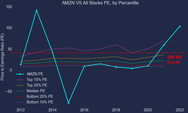 To provide some reference points, the top 5% percentileP/E in the market is currently 117x, and the top 10% percentile is 69.9x. So regardless of whichP/E you want to pick for AMZN, its current valuation is near the top 5% or the 10% percentile, a stark contrast to its below-average profitability.