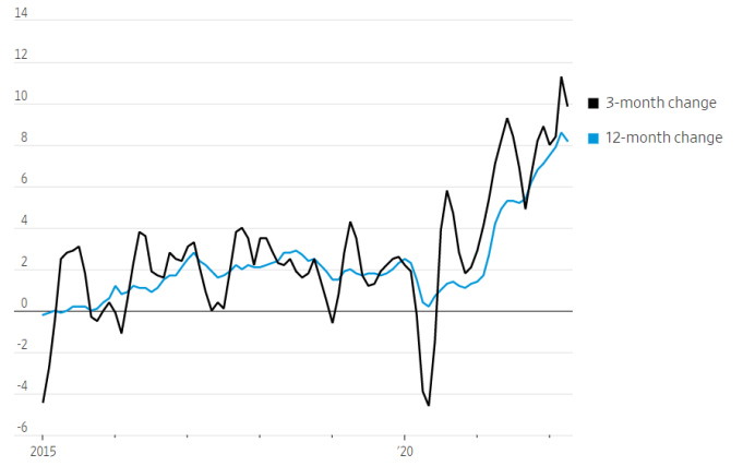 最受关注的通胀数据是消费者价格指数(CPI)的同比增速,该指数衡量了一个月与上年同期相比的物价上涨速度。Wrightson ICAP首席分析师Lou Crandall表示,尽管该指标有助于衡量较长期的通胀趋势,但可能过度关注过去的通胀水平。他和其他经济学家将CPI较3个月前的变化和较去年同期的变化描绘在了下图,前者更能体现出近期的通胀趋势。
