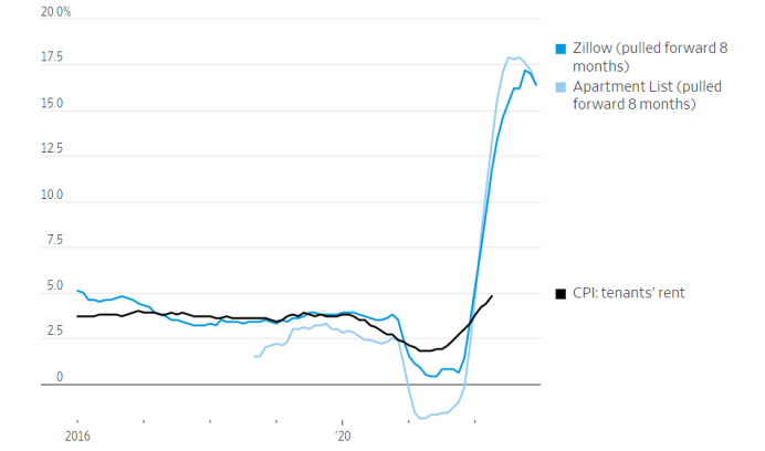 工资的快速增长会增加了美国人的收入,推高了所有东西的价格——尤其是住房成本。住房价格是了解通胀走向的关键,因为住房成本占CPI的近三分之一。Nomura Securities的美国经济学家Aichi Amemiya建议关注Zillow的租金指数和Apartment List的租金预估数据,来更好地了解住房成本趋势。