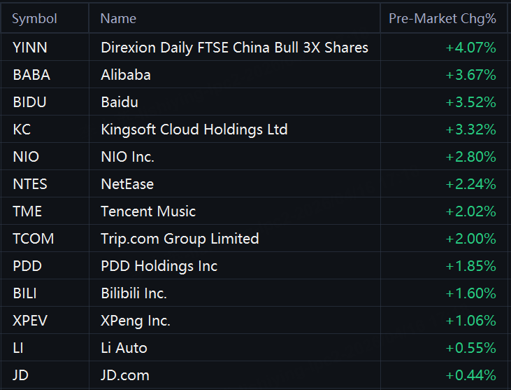 Chinese ADRs advanced in premarket trading. Direxion Daily FTSE China Bull 3X Shares, Alibaba, and Baidu rose 4%; Kingsoft Cloud and NIO rose 3%; NetEase, Tencent Music, Trip.com, PDD Holdings, and Bilibili rose 2%; XPeng rose 1%.
