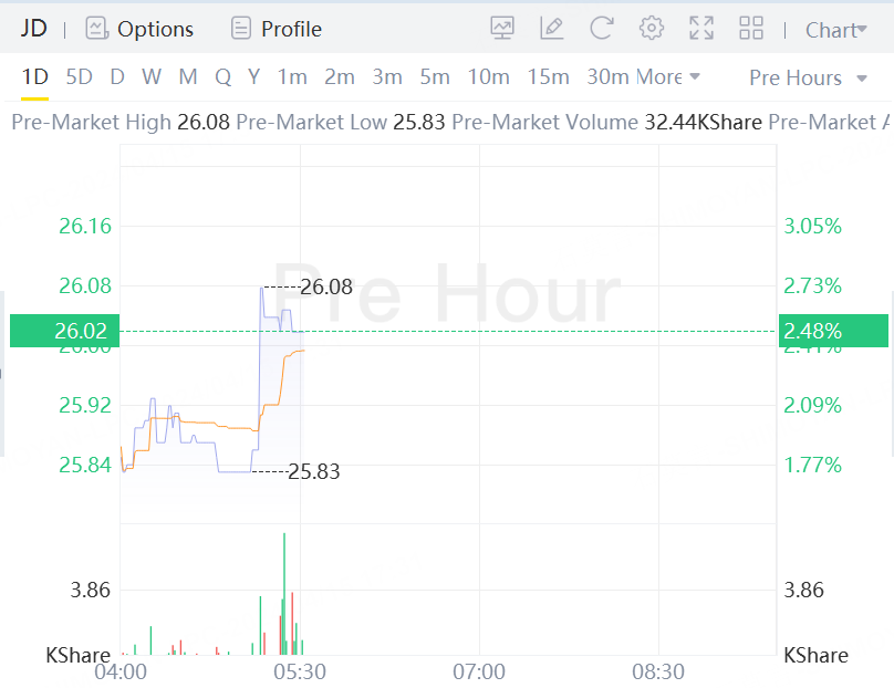 JD.com’s U.S.-listed shares rose 2.48% in premarket trading.