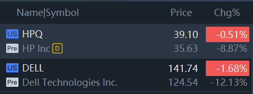 Dell Technologies Inc. and HP Inc reported quarterly financial results that suggest a long-awaited recovery of the personal computer market is stalling. Dell shares plunged 12% in premarket trading while HP Inc sank nearly 9%.